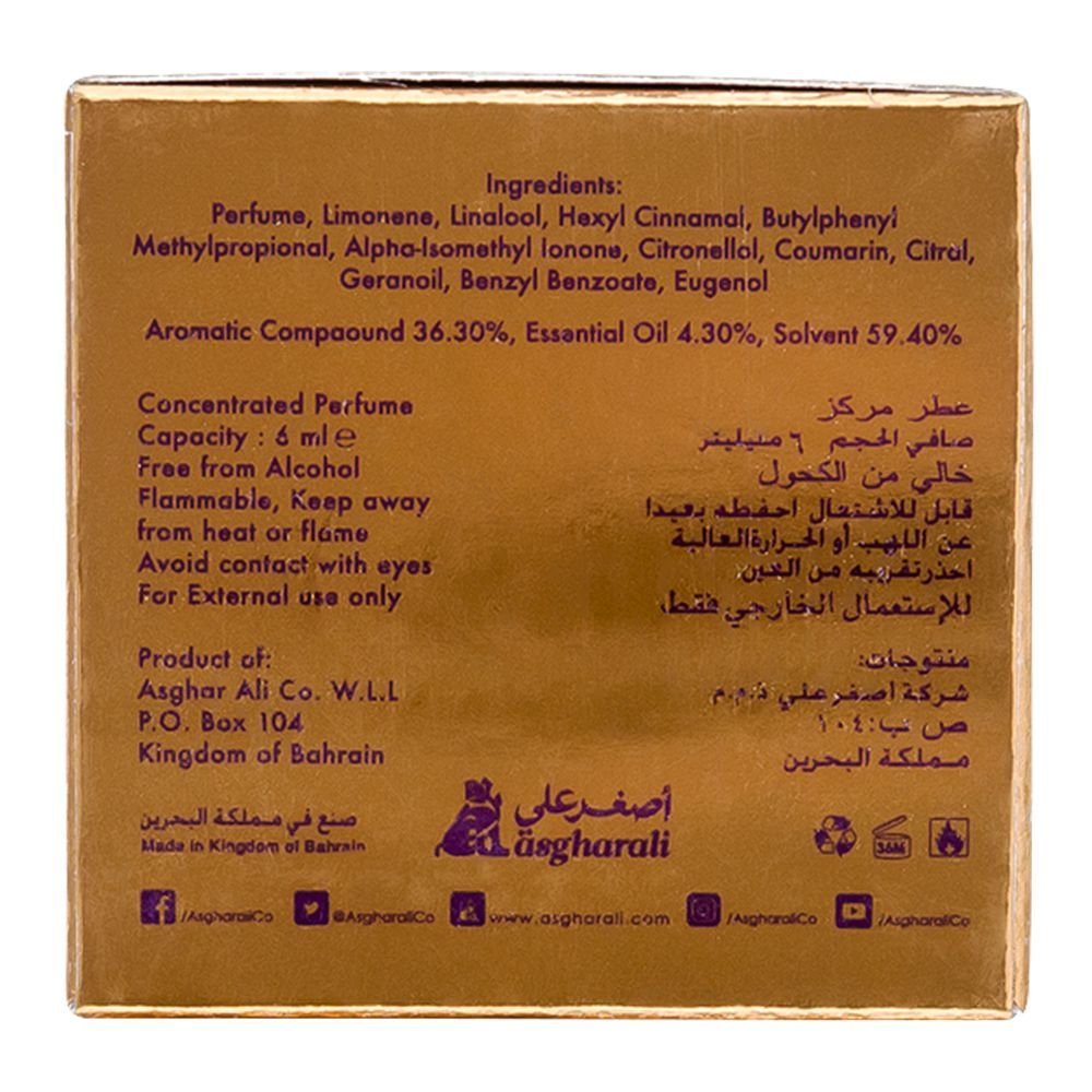 Asgharali’s Ahd Attar lets you experience a fresh blend of modern scents. The innovative perfume opens to lemony top notes that gives away a refreshing feel. The clean scent takes a step further to violet, coriander and cedar notes putting up an exotic oriental vibe with spicy aroma. It intensifies into a rich base composed of woody and amber. Ahd Attar has an overall vibrant odor that takes you through a wide range of exclusive fragrance families. This is an agreeable fragrance, which makes it suitable for offices, gyms, and every daywear.
