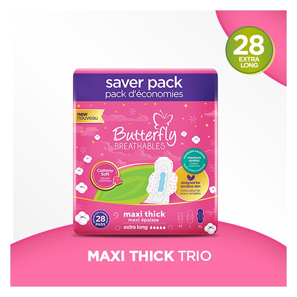Butterfly Breathables Maxi Thick Extra-Long Pads 28’s Saver Pack provides superior comfort and protection for heavy flow days. These extra-long pads are designed with breathable materials that provide optimal airflow, keeping you feeling fresh and dry throughout the day. The maxi thick design offers enhanced absorbency, preventing leaks and providing maximum protection. With a soft and gentle surface, these pads are suitable for sensitive skin, providing a comfortable and secure fit. The 28’s saver pack is perfect for making sure you have an ample supply on hand.