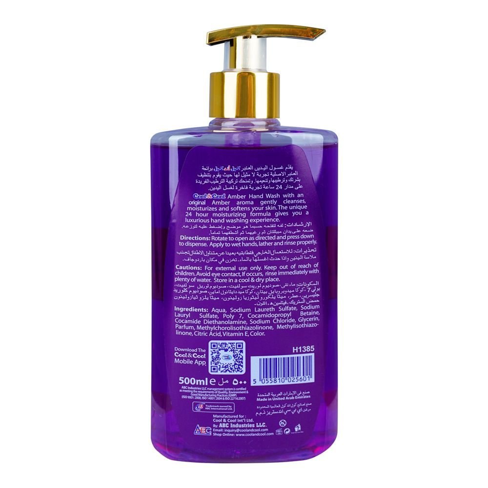Cool & Cool Amber Anti-Bacterial Hand Wash, Alcohol-Free, 99% Germ-Killing Formula, 500ml