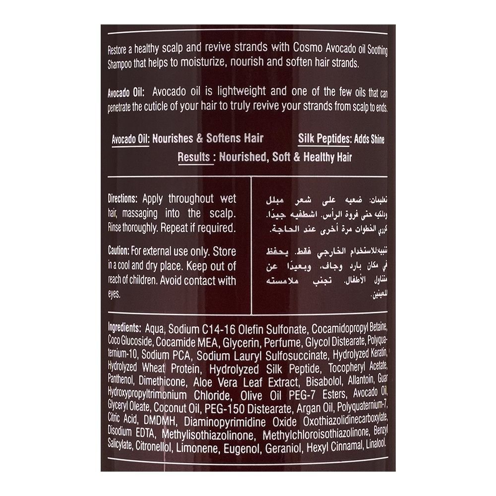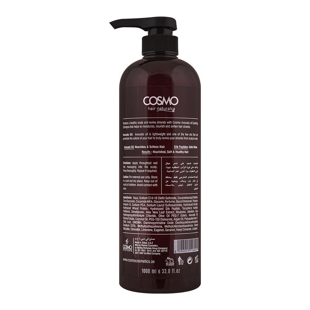 Discover the benefits of Cosmo Hair Naturals avocado soothing shampoo 1000ml, a luxurious hair care essential that brings out your hair’s natural beauty. Enriched with avocado oil strengthens the scalp, softens, and adds shine to your locks, combating dryness and damage. This sulfate and paraben-free formula is a gentle yet effective choice for your daily routine. Nourish your hair with the power of vitamin E and avocado oil, promoting hydration and managing frizz for gorgeous, vibrant curls. Shield your hair and scalp from free radicals while improving texture and shine. The key ingredients, including nutrient-rich avocado oil, restore and strengthen your hair, leaving it soft, shiny, and resilient. Embrace healthier, more beautiful hair with Cosmo avocado shampoo.