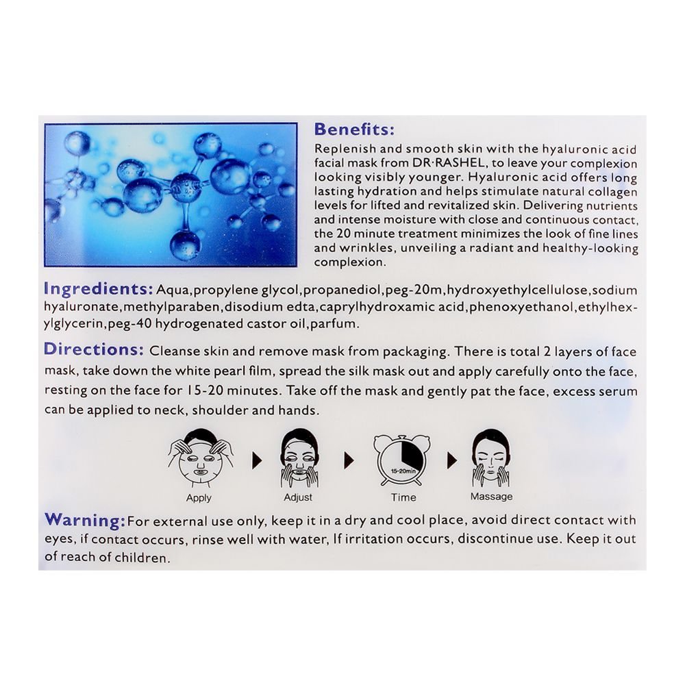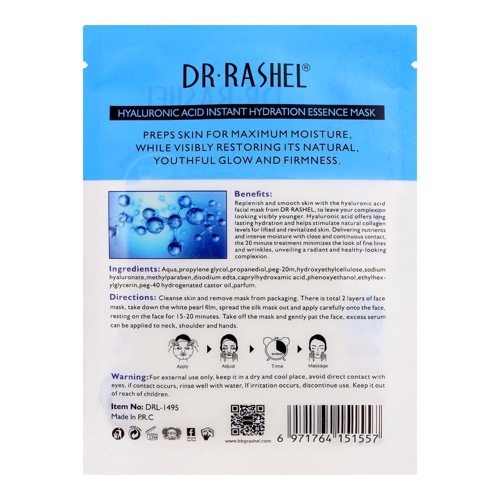 Moisturizing creams may not be enough for treating a dry and stressed skin condition. Restore your skinâs natural moisture levels with the help of Dr. Rashel Hyaluronic Acid Instant & Hydration Essence Mask. This hydrating sheet mask created with moisture-infusing hyaluronic acid takes care of your dry, rough and saggy skin. Developed to restore the youthful and natural look of skin, it hydrates the skin deeply, restores the natural moisture levels and brings a natural glow. It also reduces the appearance of wrinkles and fine lines.
