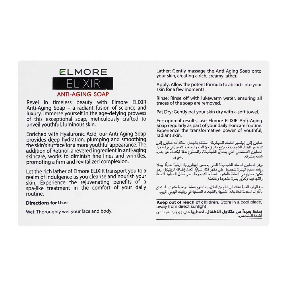 Elmore Elixir Anti-Aging Soap 100gm is designed to help reduce the signs of aging and promote youthful-looking skin. Enriched with nourishing ingredients, this soap helps to hydrate and rejuvenate the skin, diminishing the appearance of fine lines and wrinkles. Its gentle formula cleanses the skin without stripping away natural moisture, leaving it soft and supple. Ideal for daily use, it supports skin elasticity and firmness. Packaged in a 100-gram bar, this anti-aging soap is perfect for those seeking to maintain a youthful complexion.