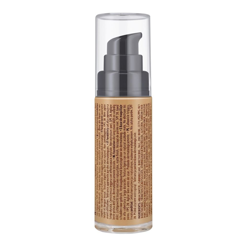 Essence I Love Flawless Skin Long Wear SPF-20 Foundation 70 Dark Sand is a well-formulated foundation designed for fair to light skin tones. This foundation offers medium to full coverage, effectively evening out skin tone and concealing imperfections for a flawless finish. Its long-lasting formula ensures your makeup stays put throughout the day without fading or smudging. Infused with SPF 20, it provides essential sun protection, guarding your skin against harmful UV rays. Despite its high coverage, the foundation feels lightweight and comfortable, avoiding a heavy or cakey appearance. This foundation is ideal for everyday use.