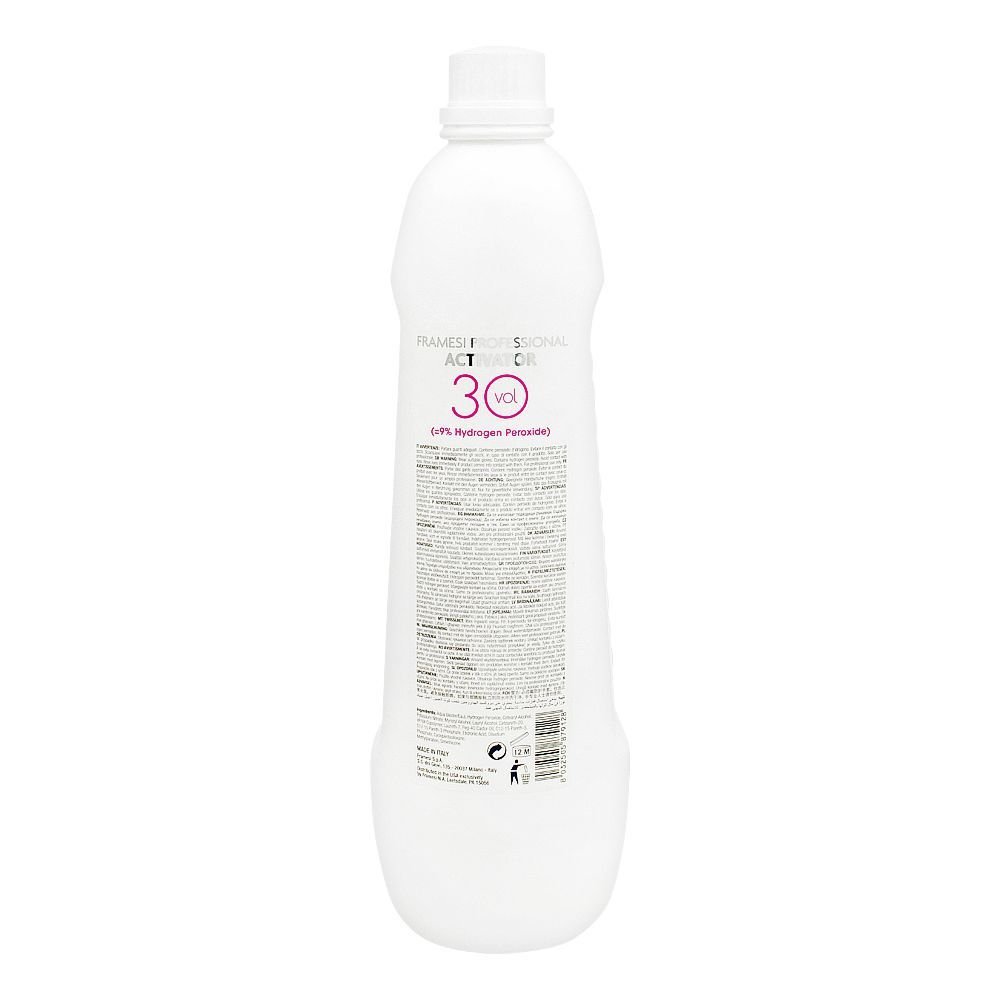 Framesi Professional Activator is a liquid cream activator with an advanced system of ingredients and technology for perfect condition, shine and color penetration deeper into hair. The 30 volume developer also works like 20 volume, but it will lighten the hair’s original color by two to three and is more efficient when the desired color is no more than two levels lighter than the original color. Choose a 30 volume developer when you want a developer that is stronger for a lighter and deeper color. Its vegan, gluten free, sulfate free, paraben free, dea free, sodium chloride free, thermal anti-aging properties and weightless.