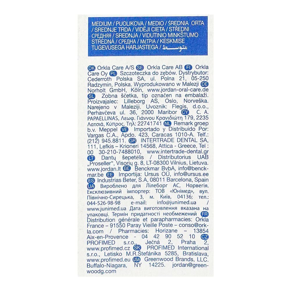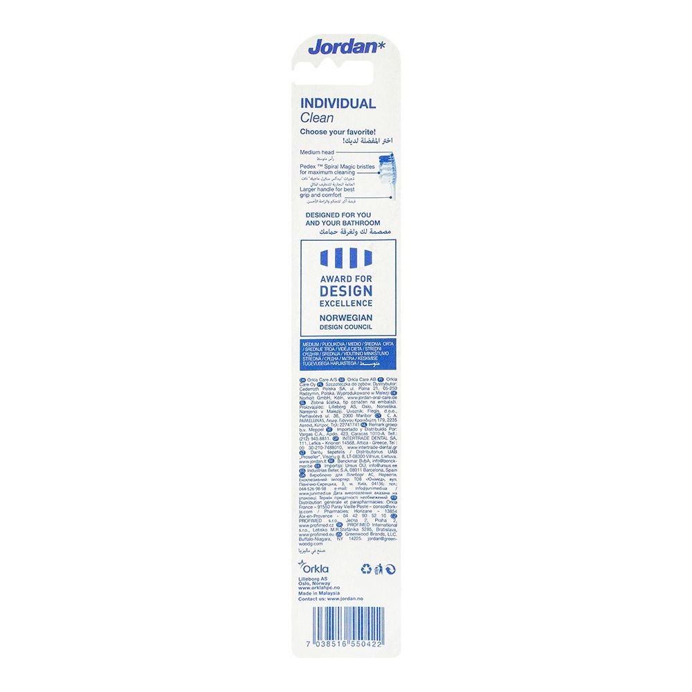 Jordan Individual Clean Toothbrush Medium #10258 is a premium quality toothbrush that gives your teeth and gums a thorough cleaning. The whole mouth can be cleaned by the medium-sized brush head because the soft bristles are kind to your gums. The included tongue cleaner helps to remove bacteria and refresh your breath, and the ergonomic handle makes it comfortable to hold. The medium-sized bristles efficiently remove plaque while massaging your gums, improving your overall oral health. Every time you use the toothbrush, your mouth is thoroughly cleansed, leaving it revitalized and fresh. This toothbrush of exceptional quality enhances your brushing experience.