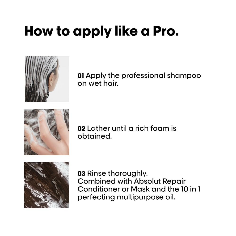 Step 1: Begin your hair care ritual by distributing the Serie Expert Absolute Repair Shampoo evenly onto wet hair. Allow the rich lather to work its magic.