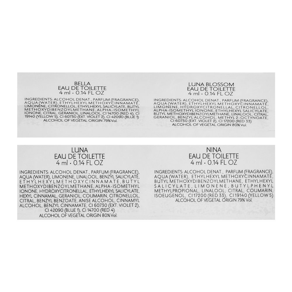 Nina Ricci Traveller Exclusive 4x4ml Set has an appealing fragrance that combines French richness, charm, sensuality, and sensitivity. The set includes; Bella Eau Da Toilette, Luna Eau Da Toilette, Luna Blossom Eau Da Toilette, and Nina Eau Da Toilette. The mood gets lifted, and the routine is boosted by the bittersweet blend of citrus extracts, peony blossoms, pralines, vanilla, cedar, and musk. Its distinctively romantic sensation is created by apple tree wood that has been slightly diluted and added. These blends do a fantastic job to open up the enticing, alluring smells. The set come in an elegant and minimalist bottle design.
