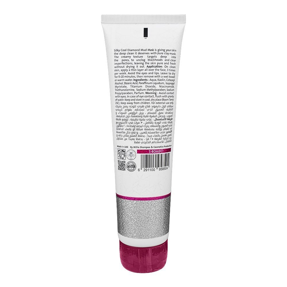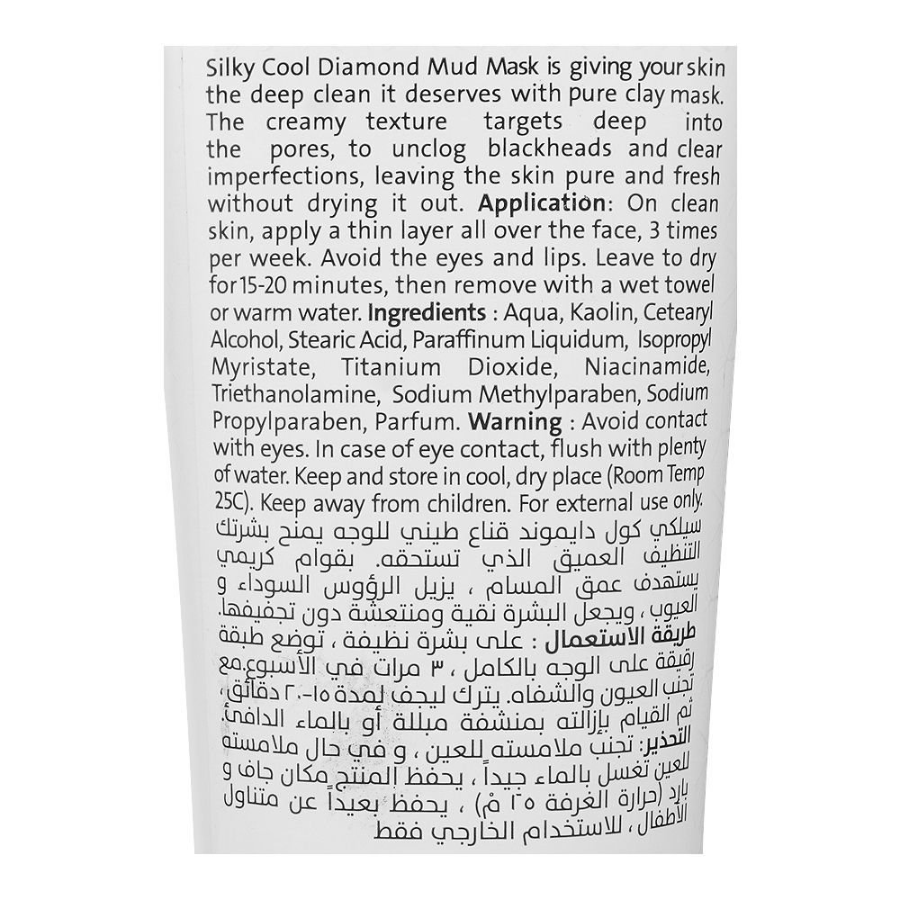Silky Cool Diamond Facial Mud Mask, For All Skin Types, 140ml is a deeply purifying treatment designed to cleanse and rejuvenate the skin. Infused with rich ingredients, this mud mask works to gently exfoliate dead skin cells and draw out impurities, leaving your skin feeling refreshed and revitalized. The rich, creamy texture spreads easily across the face, helping to tighten pores, reduce excess oil, and improve overall skin texture. Suitable for all skin types, it provides a luxurious spa-like experience at home, giving your skin a radiant glow after every use.
