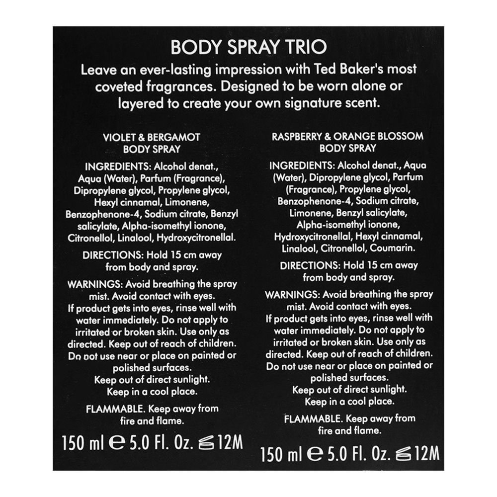 Ted Baker Body Spray Trio Violet & Bergamot + Rose & Cassis + Raspberry & Orange Blossom is an ideal way to add luxury to your daily routine. It features three alluring scents that make you feel energized and renewed all day. The Violet & Bergamot scent is a crisp and invigorating blend of violet, bergamot, and musk. The Rose & Cassis scent is a sweet and feminine blend of rose, cassis, and vanilla. The Raspberry & Orange Blossom scent is a bright and cheerful blend of raspberry, orange blossom, and jasmine. Each body spray gives off a burst of lingering aroma that surrounds your senses in a pleasant environment. You can easily step up your everyday scent game with these body sprays.